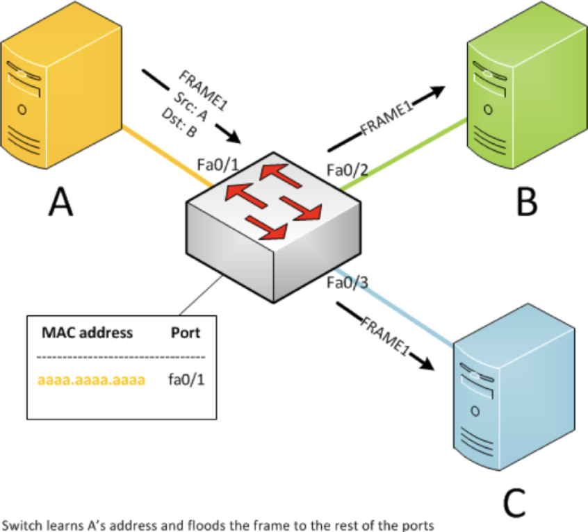 - Ak je cieľová MAC adresa nenachádza v tabuľke MAC adries