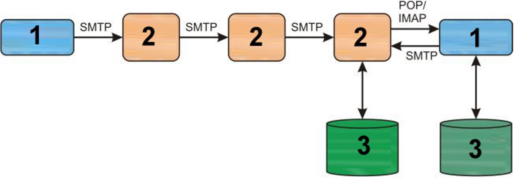 - Na obrázku je zobrazená architektúra elektronickej pošty. K číslam priraďte zodpovedajúce názvy.