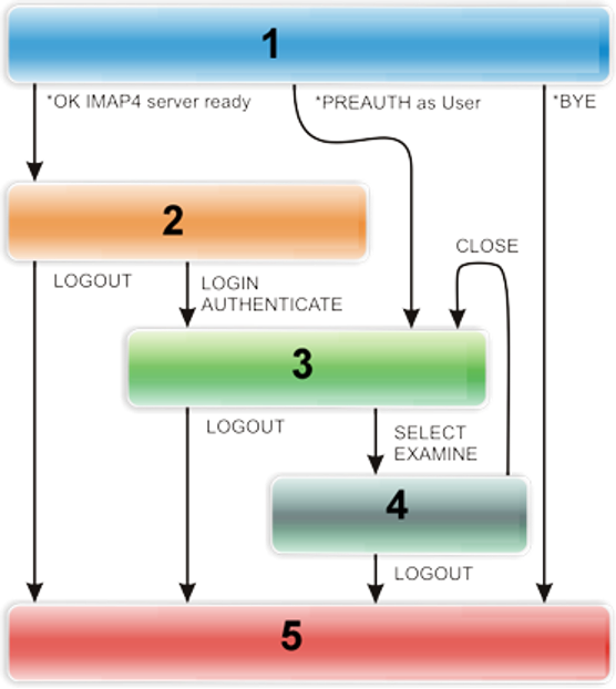- Na obrázku sú stavy IMAP4 protokolu nahradené číslami. Priraďte im zodpovedajúce názvy.