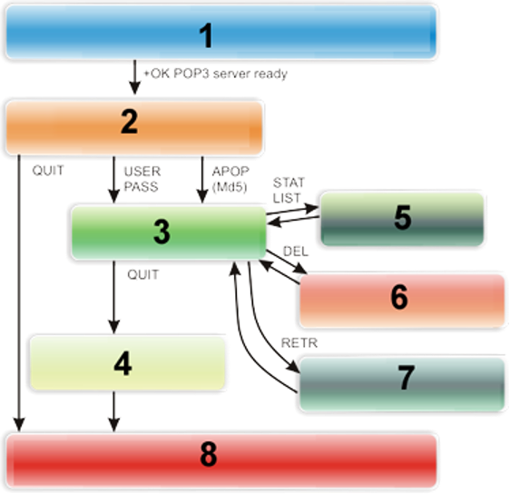 - Na obrázku sú stavy POP3 protokolu nahradené číslami. Priraďte im zodpovedajúce názvy.