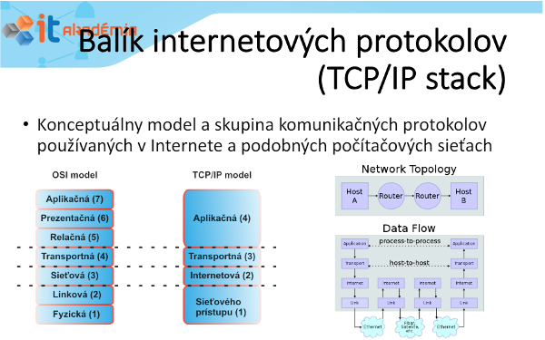 zahŕňa komunikačné protokoly, používané vo väčšine sietí a v Internete